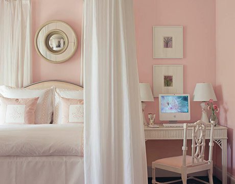 I love this shade of pink (Sherwin Williams White Dogwood) on the wall and the white canopy.